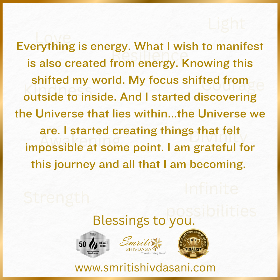 "Up until now I was breathing just to surviveā¦but after doing "The Energy Code" practices with Smriti, I am able to: Embody the truth that I AM THE BREATH that is moving in and around my body Connect and heal every pain and suffering in my body through BREATH work. Embrace and Integrate each and every part of my body through BREATH as that is the sole purpose of our life to be a SOULFUL-SELF."
