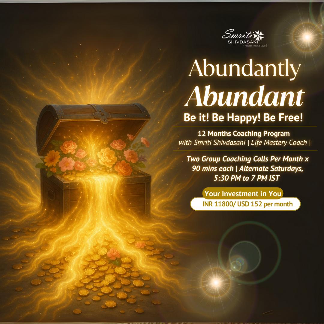 <p style="margin-left:0cm; margin-right:0cm"><span style="font-size:11pt"><span style="font-family:Calibri,sans-serif"><span style="font-size:14.0pt">Abundantly Abundant: Be it! Be Happy! Be Free!*</span><span style="font-size:14.0pt"><span style="font-family:&quot;Segoe UI Emoji&quot;,sans-serif">🌟</span></span></span></span></p> <p style="margin-left:0cm; margin-right:0cm"><span style="font-size:11pt"><span style="font-family:Calibri,sans-serif"><span style="font-size:14.0pt">12 Months Coaching Program</span></span></span></p> <p style="margin-left:0cm; margin-right:0cm"><span style="font-size:11pt"><span style="font-family:Calibri,sans-serif"><span style="font-size:14.0pt">Two Group Coaching Calls Per Month x 90 mins each</span></span></span></p> <p style="margin-left:0cm; margin-right:0cm"><span style="font-size:11pt"><span style="font-family:Calibri,sans-serif"><span style="font-size:14.0pt">7<sup>th</sup> and 28<sup>th</sup> February, 2026 &nbsp;5:30 PM to 7 PM IST</span></span></span></p>