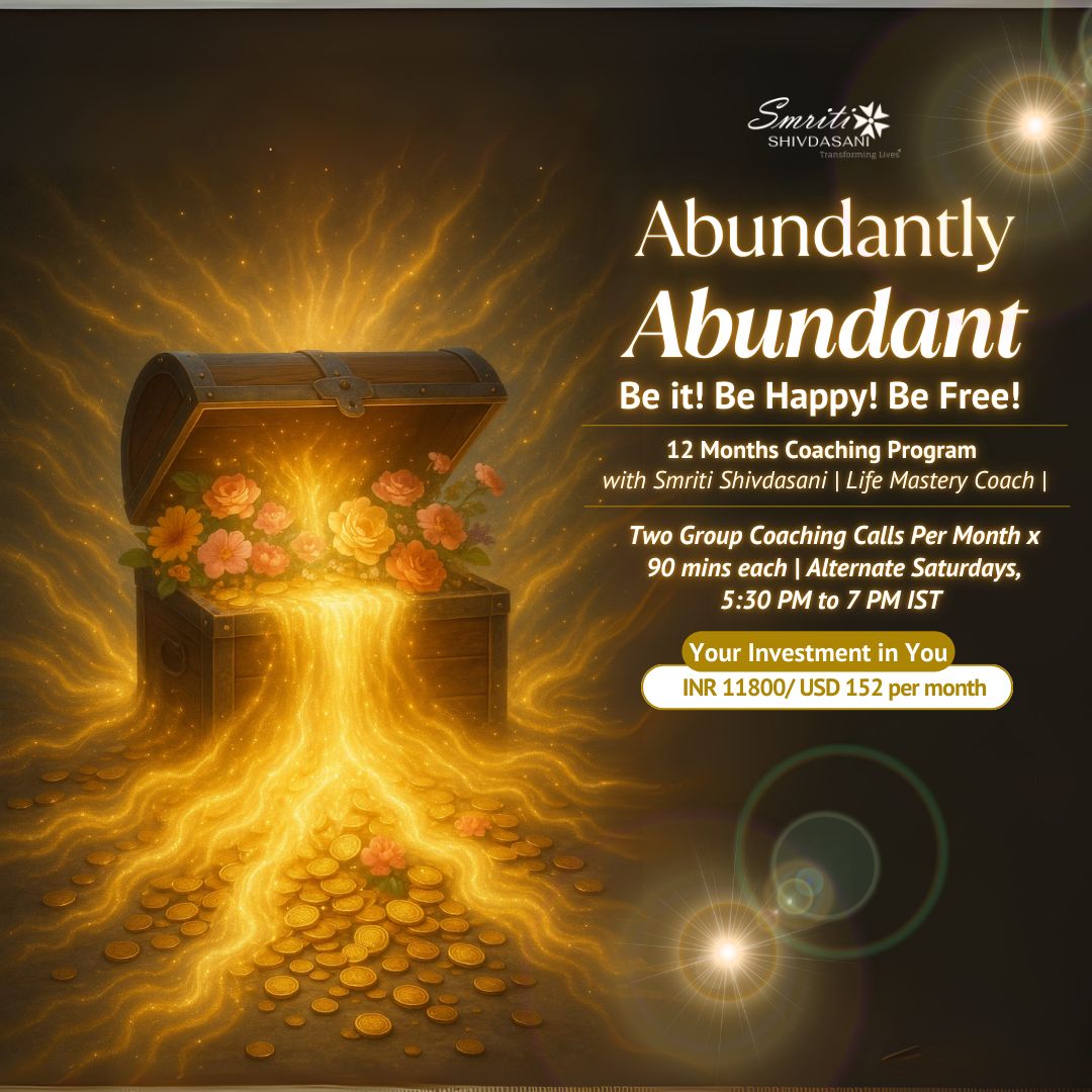 <p style="margin-left:0cm; margin-right:0cm"><span style="font-size:11pt"><span style="font-family:Calibri,sans-serif"><span style="font-size:14.0pt">Abundantly Abundant: Be it! Be Happy! Be Free!*</span><span style="font-size:14.0pt"><span style="font-family:&quot;Segoe UI Emoji&quot;,sans-serif">🌟</span></span></span></span></p> <p style="margin-left:0cm; margin-right:0cm"><span style="font-size:11pt"><span style="font-family:Calibri,sans-serif"><span style="font-size:14.0pt">12 Months Coaching Program</span></span></span></p> <p style="margin-left:0cm; margin-right:0cm"><span style="font-size:11pt"><span style="font-family:Calibri,sans-serif"><span style="font-size:14.0pt">Two Group Coaching Calls Per Month x 90 mins each</span></span></span></p> <p style="margin-left:0cm; margin-right:0cm"><span style="font-size:11pt"><span style="font-family:Calibri,sans-serif"><span style="font-size:14.0pt">9<sup>th</sup> and 21<sup>st</sup> May, 2026 &nbsp;5:30 PM to 7 PM IST</span></span></span></p> <p style="margin-left:0cm; margin-right:0cm">&nbsp;</p>